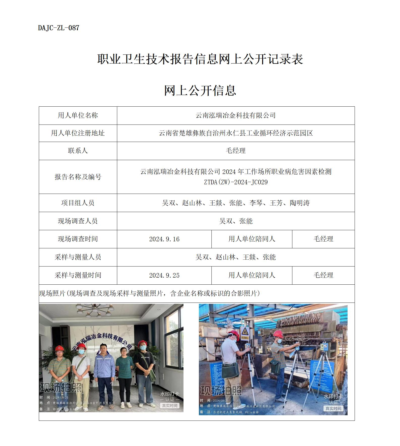 云南泓瑞冶金科技有限公司2024年工作場所職業(yè)病危害因素檢測 ZTDA(ZW)-2024-JC029