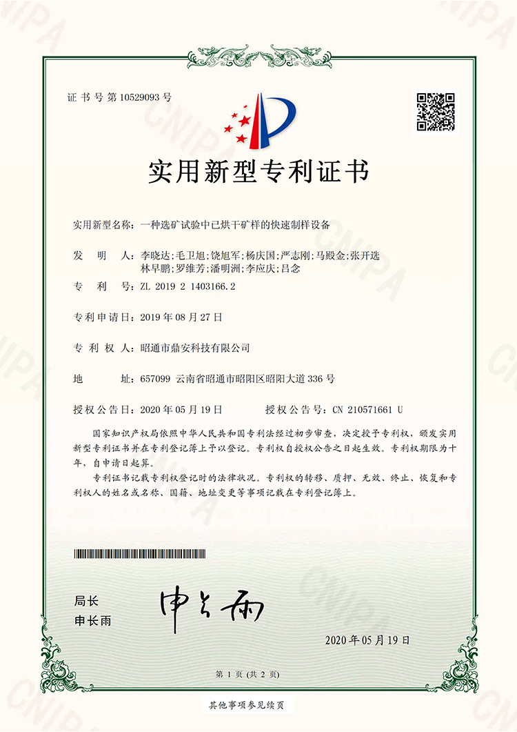 10529093一種選礦試驗中已烘干匡洋的快速制樣設(shè)備20200519實用新型專利證書